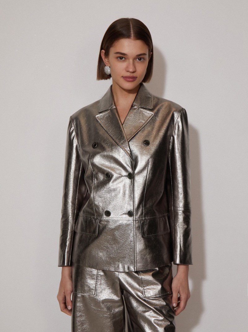Жакет из искусственной кожи. Объемный двубортный жакет дополнит образы с брюками и юбками из струящихся и блестящих тканей, джинсами и одеждой из кожи. Для модели выбрана искусственная кожа, которая визуально и на ощупь не отличима от шевро — специальное покрытие создает эффект черненого серебра. На подкладке. Посадка должна быть свободной, без натяжения в местах швов. Пожалуйста, учтите это при выборе размера. Напоминаем, что искусственная кожа может впитывать красители и сама окрашивать другие материалы. Пожалуйста, храните жакет в чехле. Сделано в России.