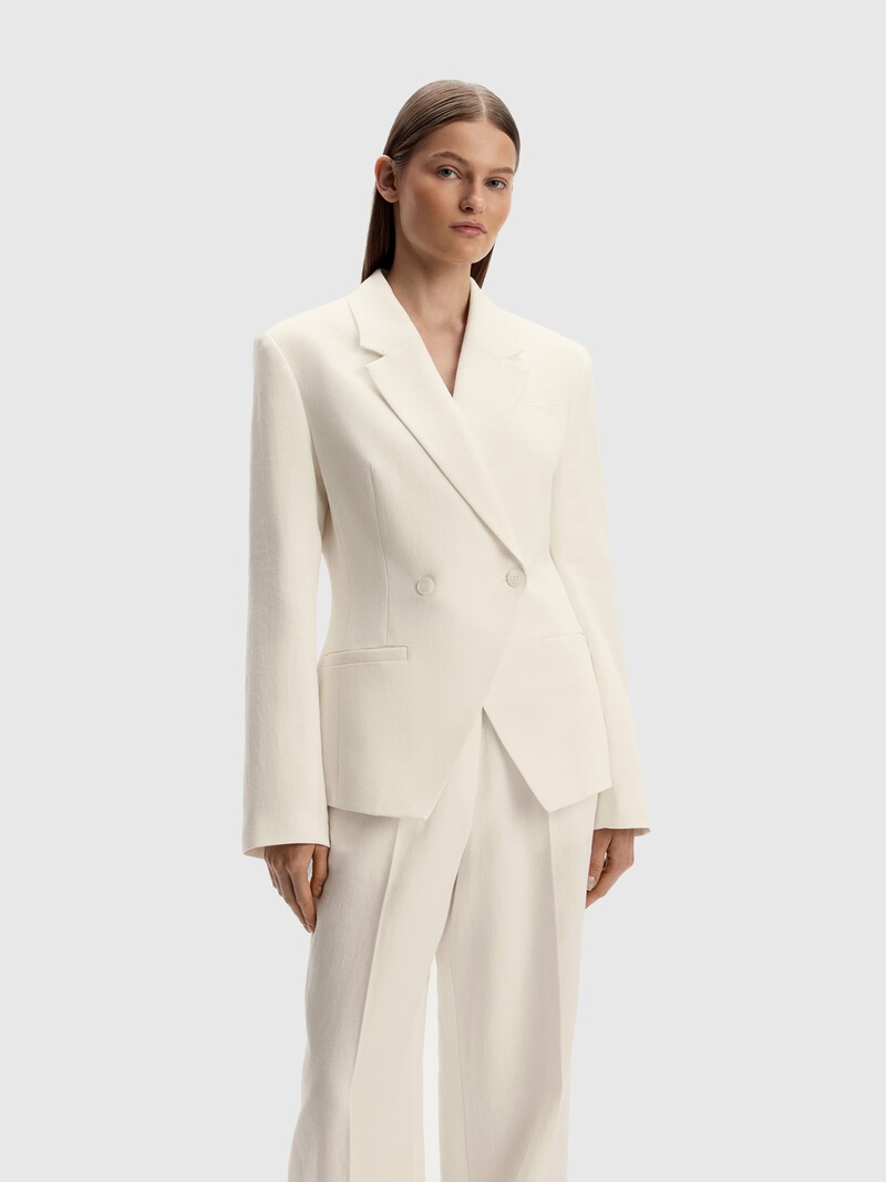Жакет из мягкого льна и гладкой вискозы создает силуэт песочных часов, подчеркивая талию. Носите его с бермудами или юбками из нашей коллекции — так образ получится женственным и комфортным. Ткань нежного молочного оттенка с неоднородной фактурой пластичнее и тяжелее, чем чистый лен, а мнется гораздо меньше. Сделано в России.