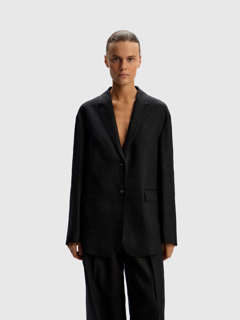 Жакет глубокого черного цвета — лаконичный и женственный. Плотный дышащий лен хорошо держит форму, и даже в теплые дни в жакете не будет жарко благодаря свободному силуэту и комфортной подкладке из вискозы и хлопка. European Flax — сертифицированный европейский лен высшего качества: помогает сократить глобальный углеродный след, безопасен для человека и становится мягче со временем. Сделано в Китае.