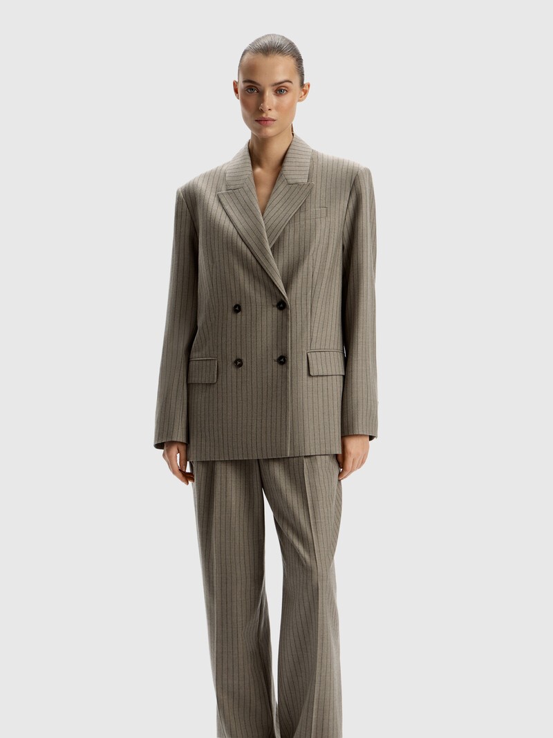 Двубортный удлиненный жакет напоминает мужские модели, но женскому образу придает особую хрупкость — к примеру, в сочетании с легинсами, шелковой комбинацией или брюками из нашей коллекции. Материал — тонкая шерсть глубокого табачного оттенка с деликатной, как будто прочерченной карандашом, графитовой полоской. Подкладка из шелковистой поливискозы. Сделано в России.