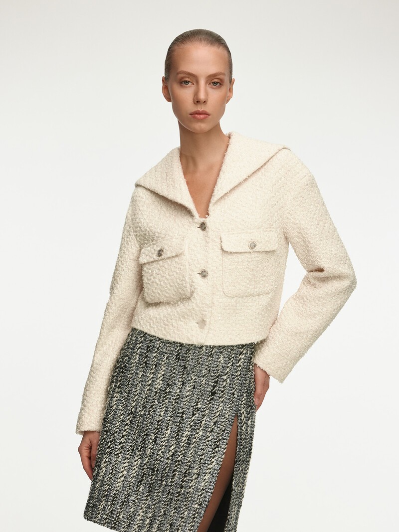 Твидовый жакет с широким отложным воротником, напоминающим гюйс. Для этой модели мы выбрали фактурную ткань с вплетенной нитью люрекса, которая придает материалу эффект мерцания. Благодаря аккуратному силуэту, жакет несложно интегрировать в повседневный гардероб и носить после праздников. Шерстяные волокна могут покалывать, поэтому мы добавили подкладку. Деликатный материал требует бережного обращения: аксессуары могут оставить затяжки или повредить нить.