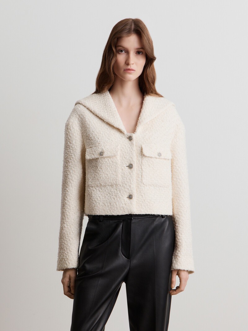 Твидовый жакет с широким отложным воротником, напоминающим гюйс. Для этой модели мы выбрали фактурную ткань с вплетенной нитью люрекса, которая придает материалу эффект мерцания. Благодаря аккуратному силуэту, жакет несложно интегрировать в повседневный гардероб и носить после праздников. Шерстяные волокна могут покалывать, поэтому мы добавили подкладку. Деликатный материал требует бережного обращения: аксессуары могут оставить затяжки или повредить нить. Сделано в Китае.