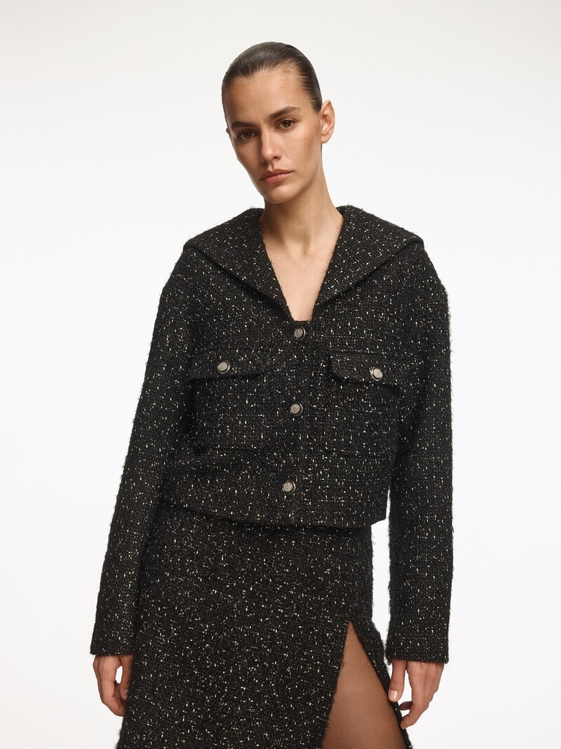 Твидовый жакет с широким отложным воротником, напоминающим гюйс. Для этой модели мы выбрали фактурную ткань на основе мягкой шерсти с вкраплениями мерцающего люрекса — благодаря материалу образ получается уютным и женственным одновременно. Сочетайте с брюками, джинсами или юбкой из нашей коллекции. На подкладке. Деликатный материал требует бережного обращения: аксессуары могут оставить затяжки или повредить нить.