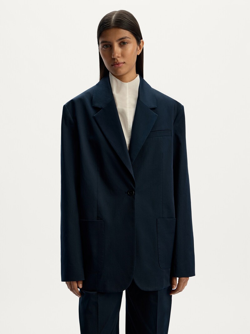 Свободный жакет из плотного хлопка в оттенке морской глубины — для лаконичных комфортных образов в теплый сезон. Наденьте его нараспашку, чтобы тонкий контрастный кант вдоль бортов был заметен в движении, или застегнитесь на единственную пуговицу. Подкладку мы сделали из хлопка с вискозой — такая ткань дышит и приятна на ощупь. Сделано в России.
