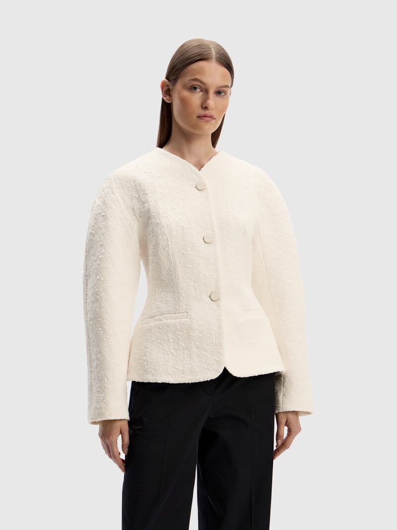 Изящный и аккуратный жакет из жаккарда — с акцентом на талии и достаточно свободной посадкой. Мы выбрали для него ткань от нашего постоянного поставщика из Франции. Такой жакет можно носить круглый год — днем, вечером или когда вам захочется вспомнить о лете — фактура материала точь-в-точь как след морских волн на прибрежном песке.