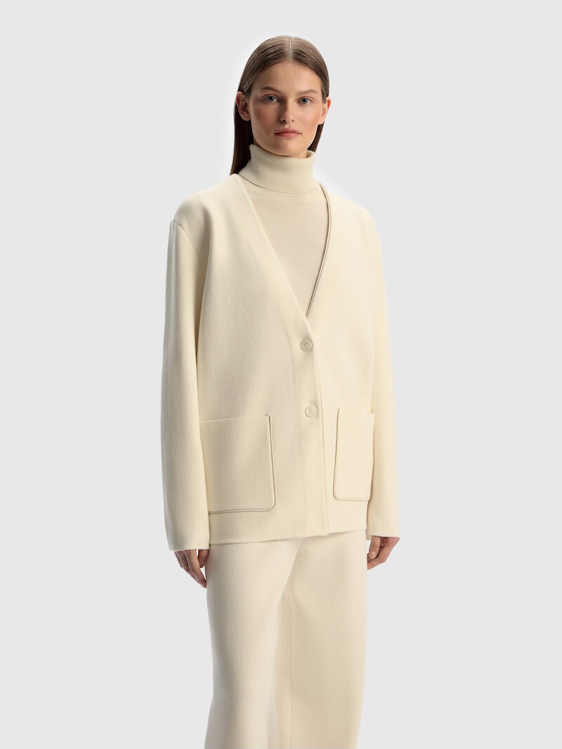 Уютный прямой жакет классической длины — свободный, с накладными карманами и акцентной отделкой кожей. Связан из мягкой и легкой пряжи из мериносовой шерсти и хлопка. Плотное комбинированное переплетение делает трикотаж ровным и гладким — модель кажется сшитой из фактурной ткани и выглядит аккуратно, но отлично подходит для неформальных расслабленных образов. У этого изделия низкая пиллингуемость. При правильном уходе первые пилли могут появиться на нем в среднем через 10 носок. Сделано в Китае.