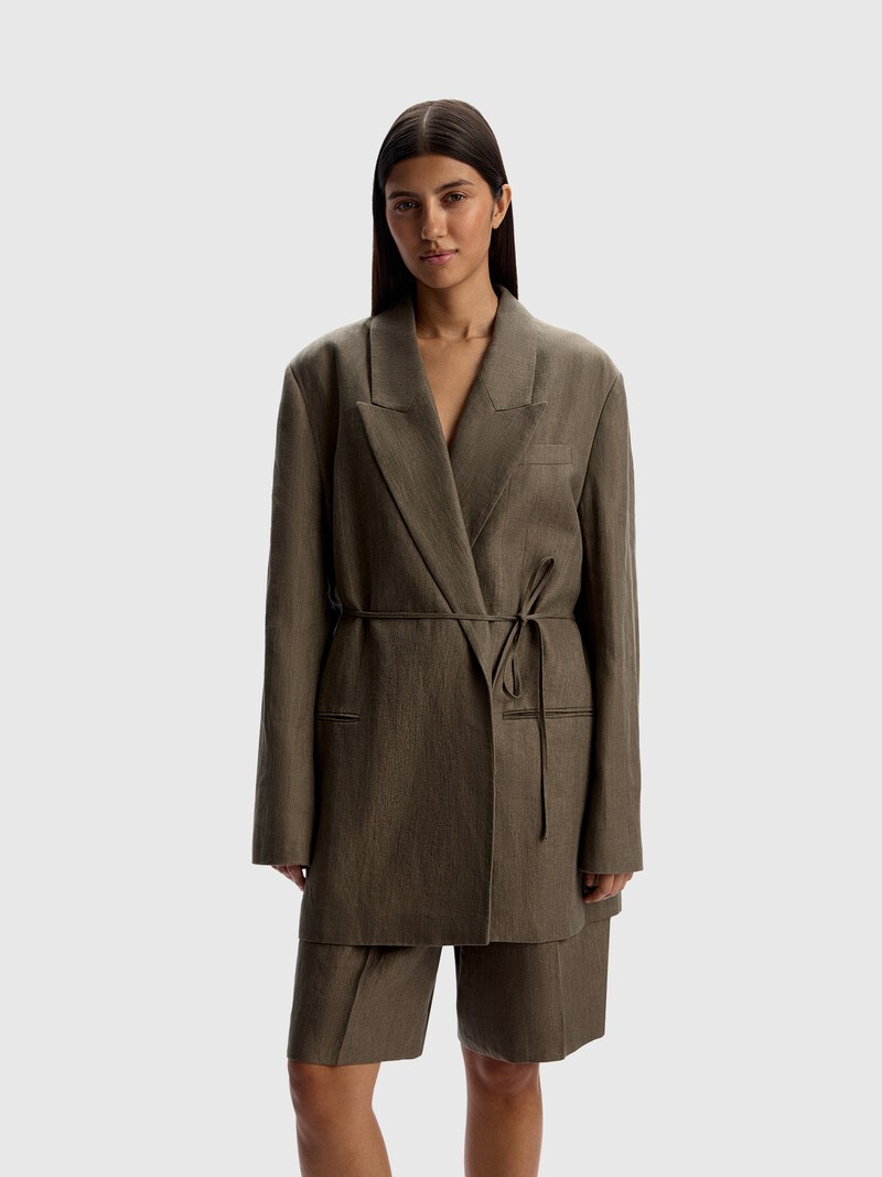 Легкий жакет с тонким поясом — если его завязать, ткань на груди создаст мягкую линию и подчеркнет силуэт. Плотный французский лен глубокого табачного оттенка окрашен в нитях, что придает материалу винтажные эффекты. European Flax — сертифицированный европейский лен высшего качества: помогает сократить глобальный углеродный след, безопасен для человека и становится мягче со временем. Сделано в Китае.