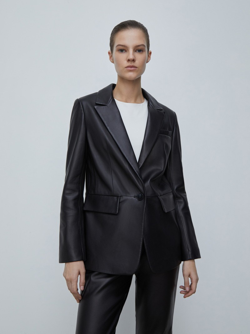 Жакет из натуральной кожи. Наш бестселлер стал ближе к классическим костюмным жакетам — можно носить его как вечерний блейзер с платьями и брюками, надеть под пальто. - Полуприлегающий силуэт - Застежка на пуговицы - На подкладке из шелковистой поливискозы - Отборная натуральная кожа шевро — плотная и мягкая, с гладкой матовой текстурой - Минимальная обработка позволяет сохранить природные свойства натуральной кожи — она дышит и согревает, хорошо восстанавливается и садится по фигуре - Может окрашивать одежду светлых оттенков, так как использованы щадящие закрепители цвета - Международный стандарт Leather Working Group гарантирует, что фабрика-производитель работает в соответствии с принципами устойчивого развития Сделано в Турции.