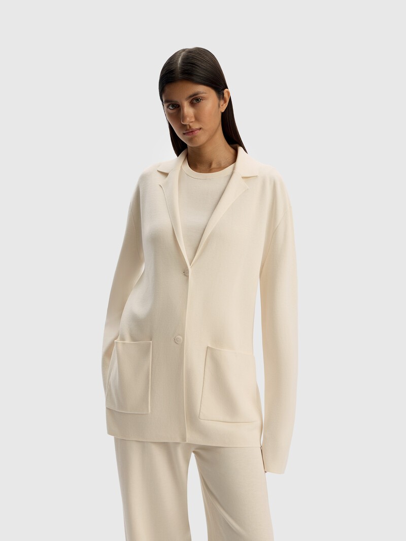 Прямой лаконичный жакет из шелка и хлопка — уютная альтернатива текстильному блейзеру. Мы связали его из тонкого и плотного трикотажа. Накладные карманы и мягкая линия плеча придают модели расслабленный вид — то, что нужно в теплые дни. У этого изделия низкая пиллингуемость. При правильном уходе первые пилли могут появиться на нем в среднем через 10 носок. Сделано в Китае.
