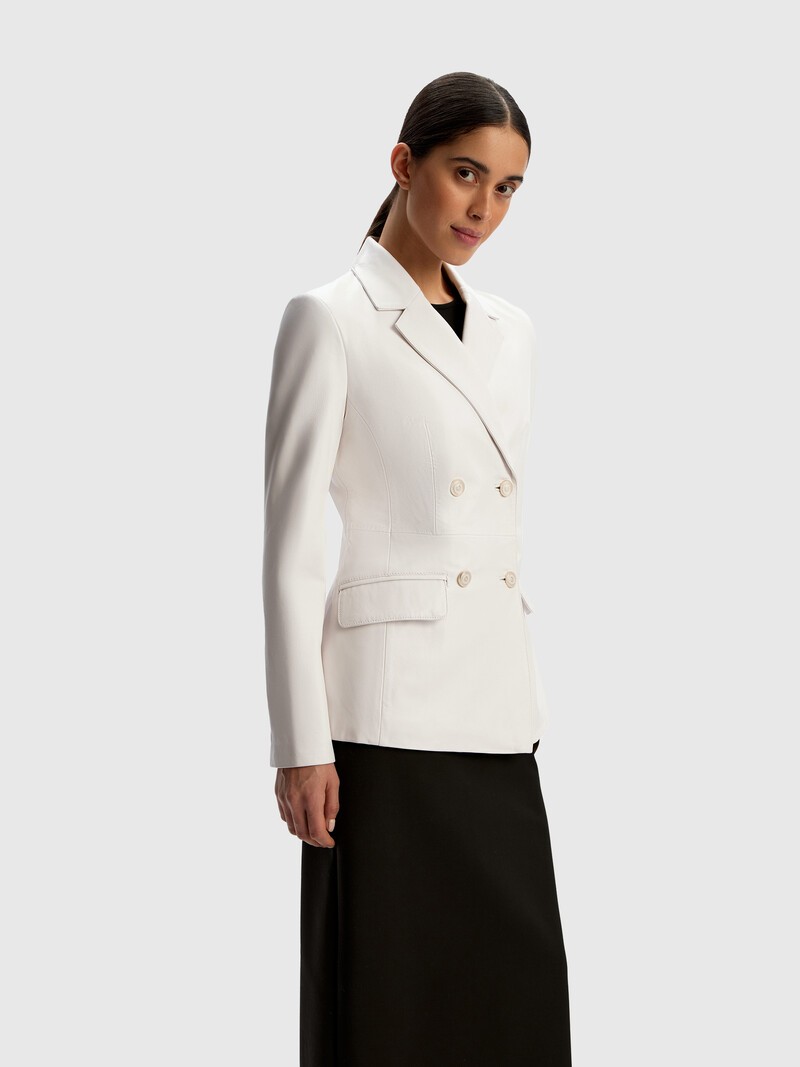 Двубортный жакет из гладкой белой кожи. Прилегающий силуэт, округлая линия бедер, рельефы на спинке, аккуратное втачное плечо — такая модель поможет создать как повседневный, так и вечерний образ в сочетании с брюками или джинсами. Материал — тонкая, мягкая кожа ягненка с деликатным естественным блеском. На подкладке из поливискозы. При выборе размера убедитесь, что жакет сидит свободно — так он прослужит вам намного дольше. Золотой статус LWG означает, что фабрика полностью отвечает требованиям к экологической безопасности процессов и химикатов, имеет все необходимые очистные сооружения и заботится о здоровье сотрудников.