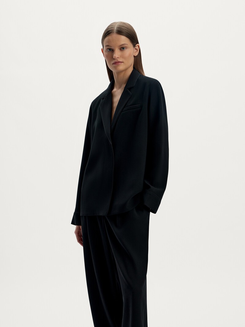 Жакет в пижамном стиле — спущенное плечо, супатная застежка на пуговицы, лацканы воротника и манжеты с отделкой кантом. Мы сшили эту модель из гладкой матовой ткани, напоминающей плотный шелк. Сочетайте с брюками из нашей коллекции. На частичной подкладке. Сделано в России.