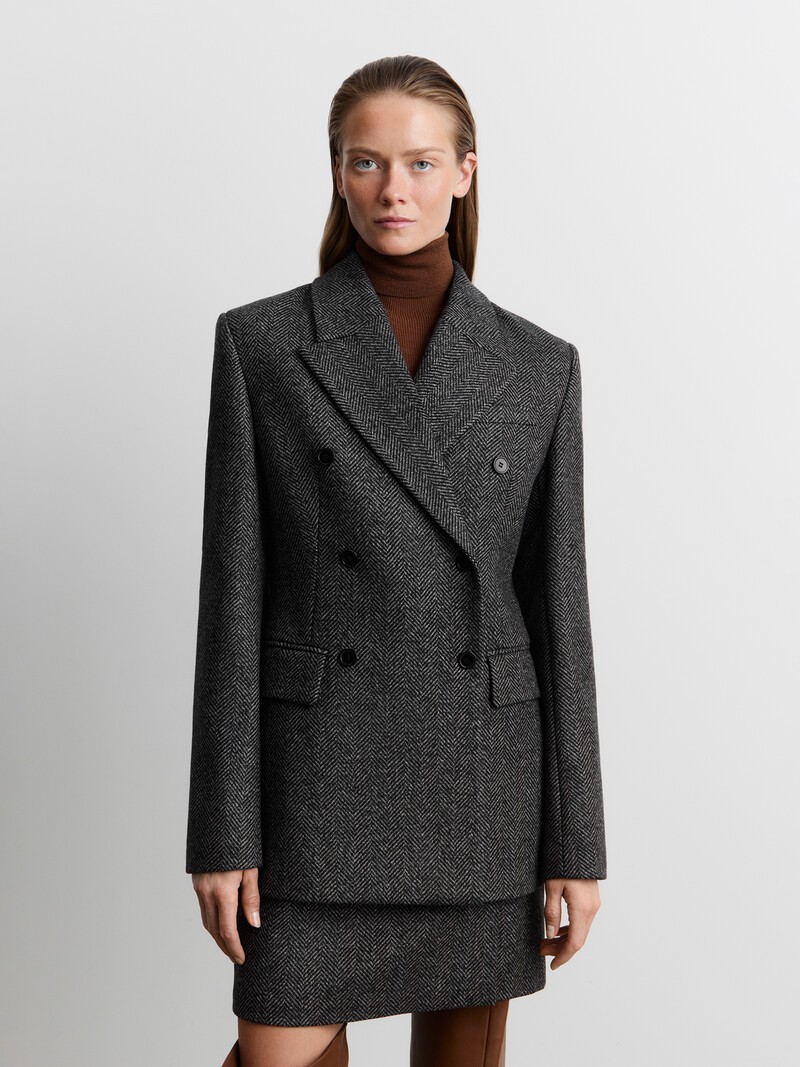 Бестселлер нашей коллекции — двубортный жакет, который формирует идеальный силуэт благодаря сочетанию плавных линий и акценту на талии. Плотная шерсть в елочку напоминает ткань для пальто — она превосходно держит форму, а сочетание контрастных нитей придает материалу глубину. На мягкой, шелковистой подкладке на основе купро.