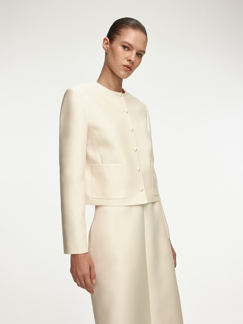 1. Ткань из смеси шерсти австралийского мериноса и шелка Mulberry — плотная, тяжелая, с природным лоском 2. Простая форма этого жакета — результат мастерства конструкторов 12 STOREEZ. В жакете нет вытачек, и чтобы добиться идеальной посадки, наша команда создавала уникальные лекала, как делают для изделий prêt-à-porter 3. Подкладка из мягкой купро с полиэстером делает жакет приятным к телу и долговечным
