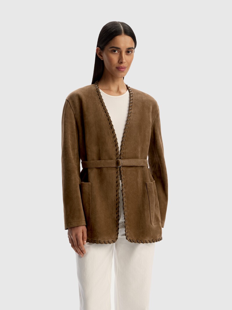 Уютный замшевый жакет с глубоким вырезом, накладными карманами и акцентной отделкой кожаным шнурком — результатом кропотливой ручной работы. Мы выбрали для этой модели материал с ровным ворсом в глубоком натуральном оттенке. Такая замша пластичная, долговечная и хорошо сохраняет тепло. На подкладке. Серебряный статус LWG означает, что фабрика руководствуется принципами экологической безопасности используемых красителей, имеет необходимые очистные сооружения и заботится о здоровье сотрудников. Сделано в Турции.