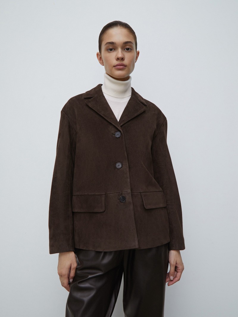 Жакет из замши. Свободный крой позволяет носить жакет и на тонкие водолазки, и на теплые джемперы, сочетать как с расслабленными джинсами, так и с брюками из кожи. Для модели выбрали плотную и мягкую замшу — она пластична и приятна к коже, хорошо дышит и согревает. На подкладке. Международный стандарт Leather Working Group гарантирует, что фабрика-производитель работает в соответствии с принципами устойчивого развития. Сделано в Турции.