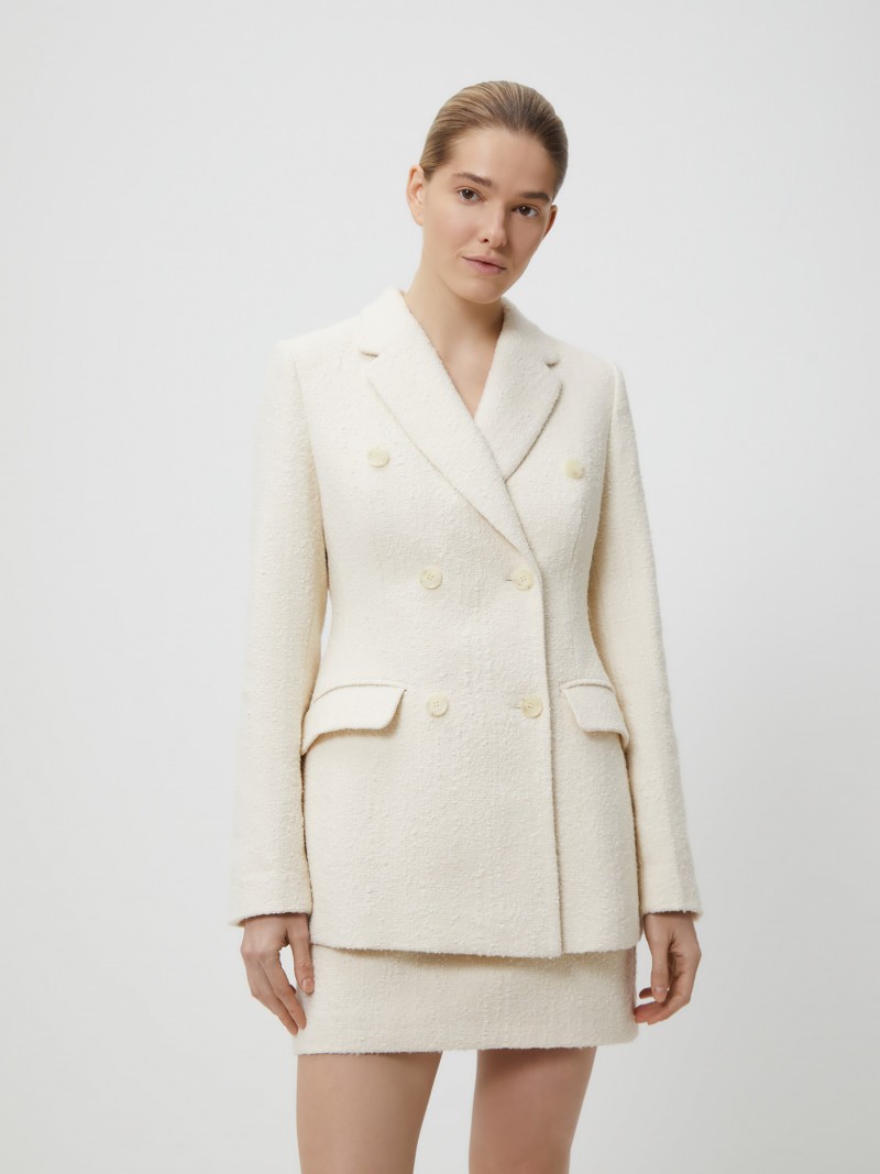 Твидовый жакет с двубортной застежкой создает силуэт песочных часов благодаря акценту на талии. Носите его с широкими брюками в пол или создайте яркий образ с юбкой из нашей коллекции. Для модели выбрали итальянский твид, в котором плотно сплетаются хлопковые и шерстяные нити: маленькие узелки на поверхности материала придают ему уютный и расслабленный вид. Деликатная ткань требует бережного обращения. Острые предметы и аксессуары могут привести к затяжкам или повредить нить. Сделано в России.